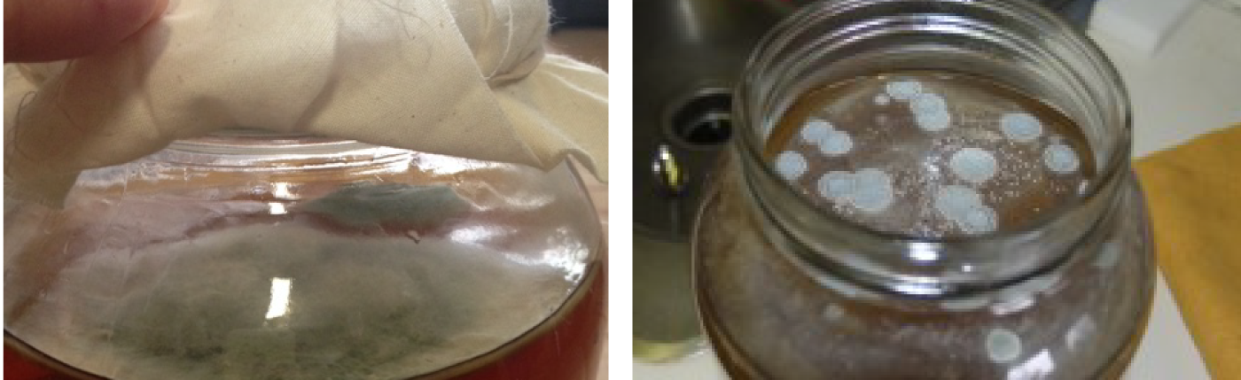 Just like the molds you would see on bread or cheese, an unhealthy kombucha culture will develop fuzzy blue, green, or white mold. It will look something like the below photos.