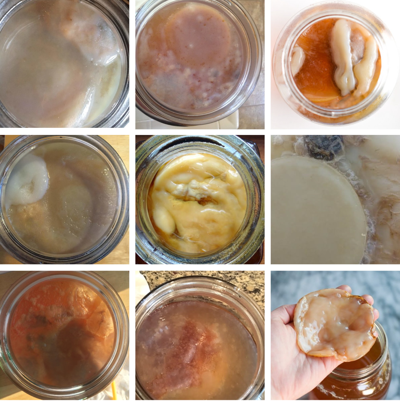 A healthy kombucha SCOBY will have brown, stringy or blob-like debris attached to it (the yeast). It can be bumpy or smooth on top, and have clear dots or bubbles. When you drop your new culture into the brew jar along with the starter liquid, your culture can sink to the bottom, float in the middle, or float on top—all locations are just fine and will ferment your kombucha just the same. Here are some photos of beautifully weird looking (but healthy) SCOBYs in all their glory.